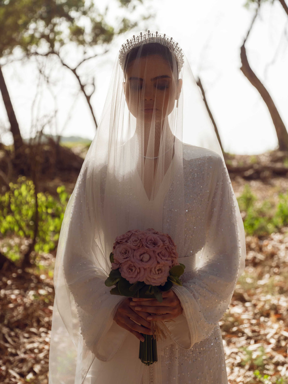 Three rows of dfira structure the silhouette with sophistication, revealing a rare piece, designed for a bride looking for deep and timeless elegance.
