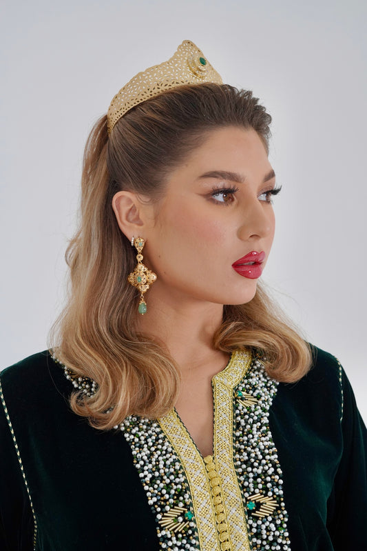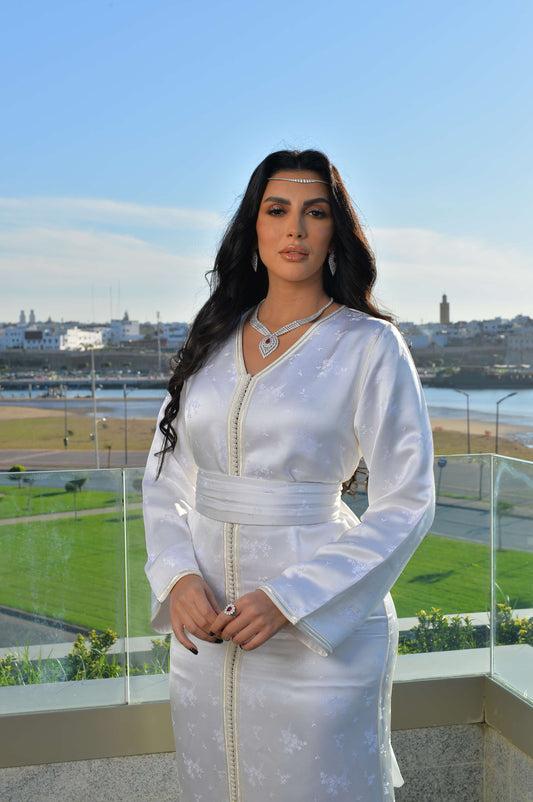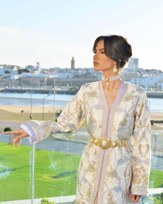 An exclusive edition celebrating timeless elegance and Moroccan craftsmanship. Each outfit embodies a perfect harmony between tradition and modernity, with meticulous attention to detail and finishing. Designed in Morocco, created for you. This piece is entirely handmade, respecting the finest Moroccan traditions.