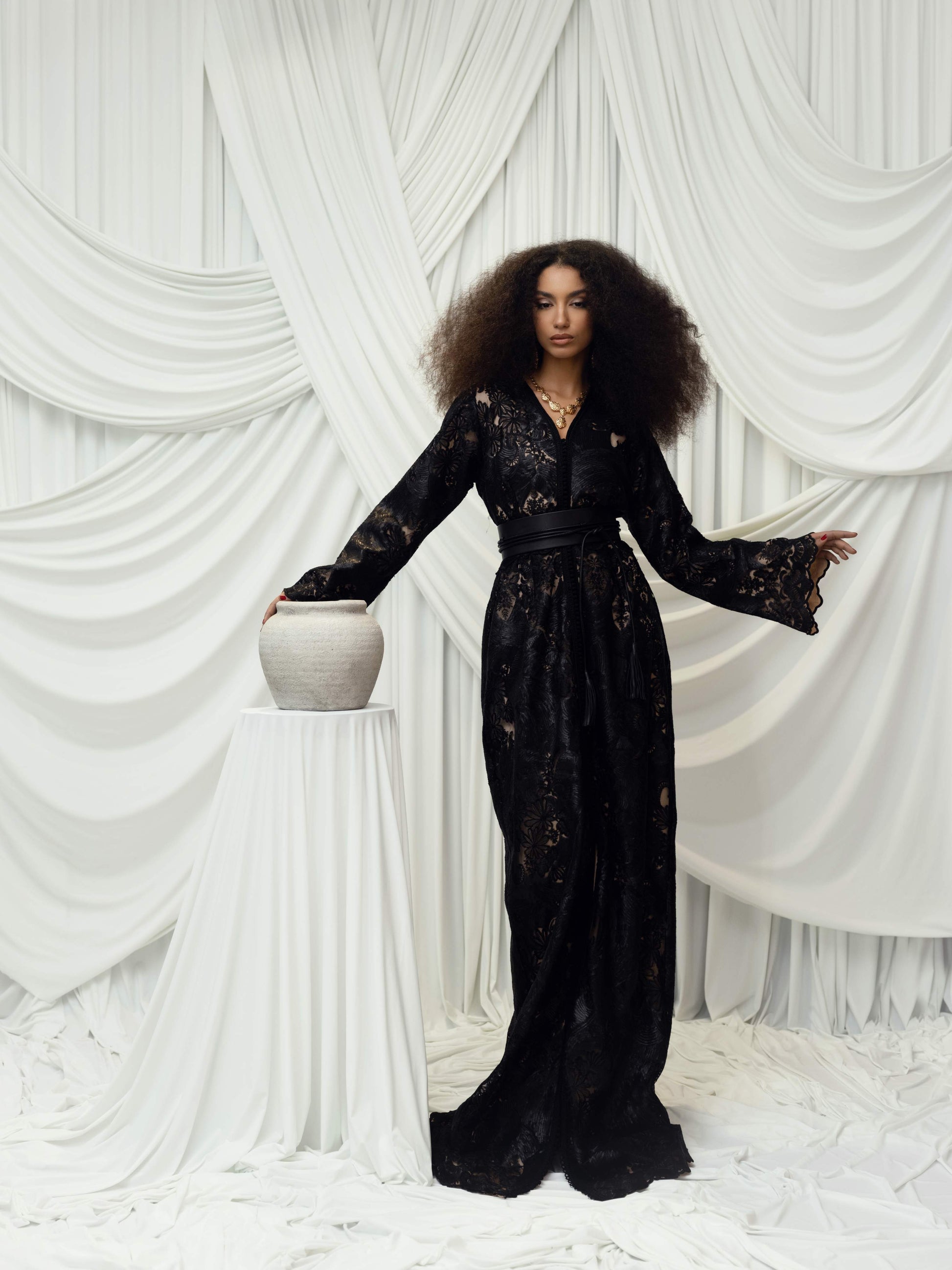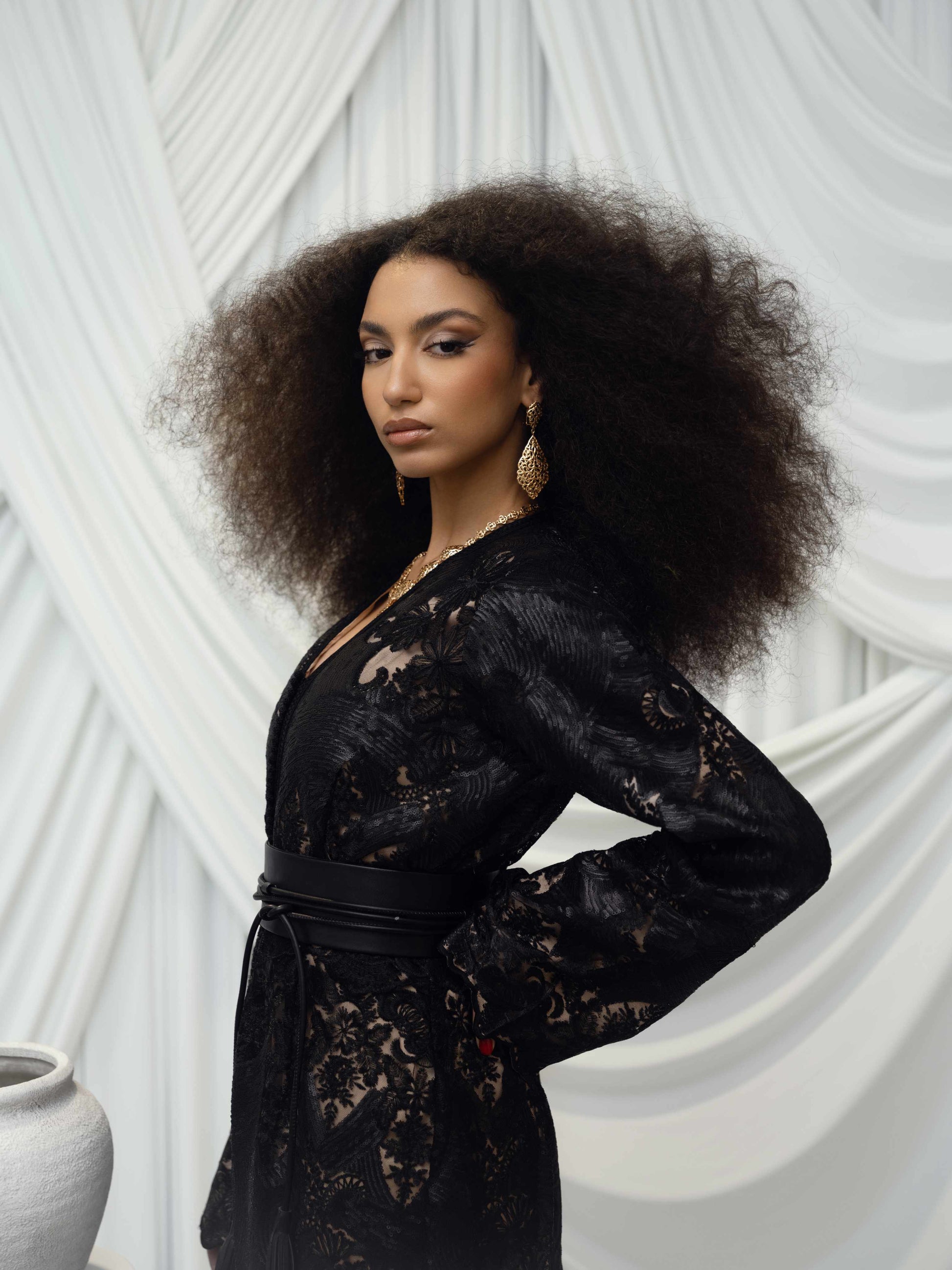 La pièce est structurée par un travail précis de dfira et de 39ad, apportant tenue et définition à la silhouette. Les sequins ton sur ton créent un jeu de lumière subtil, révélant la profondeur du noir sans excès.