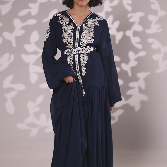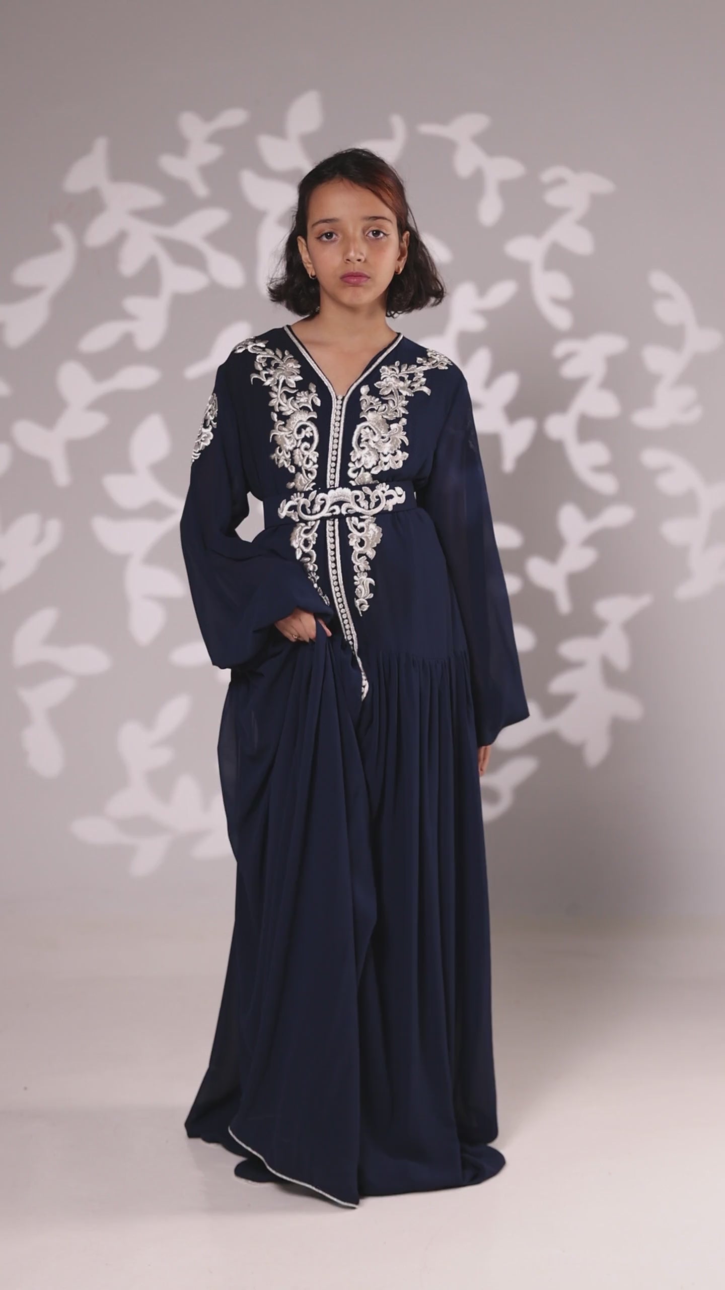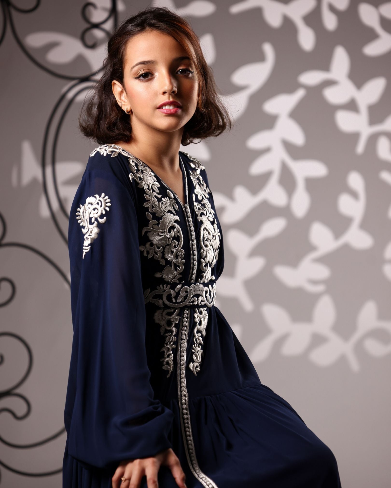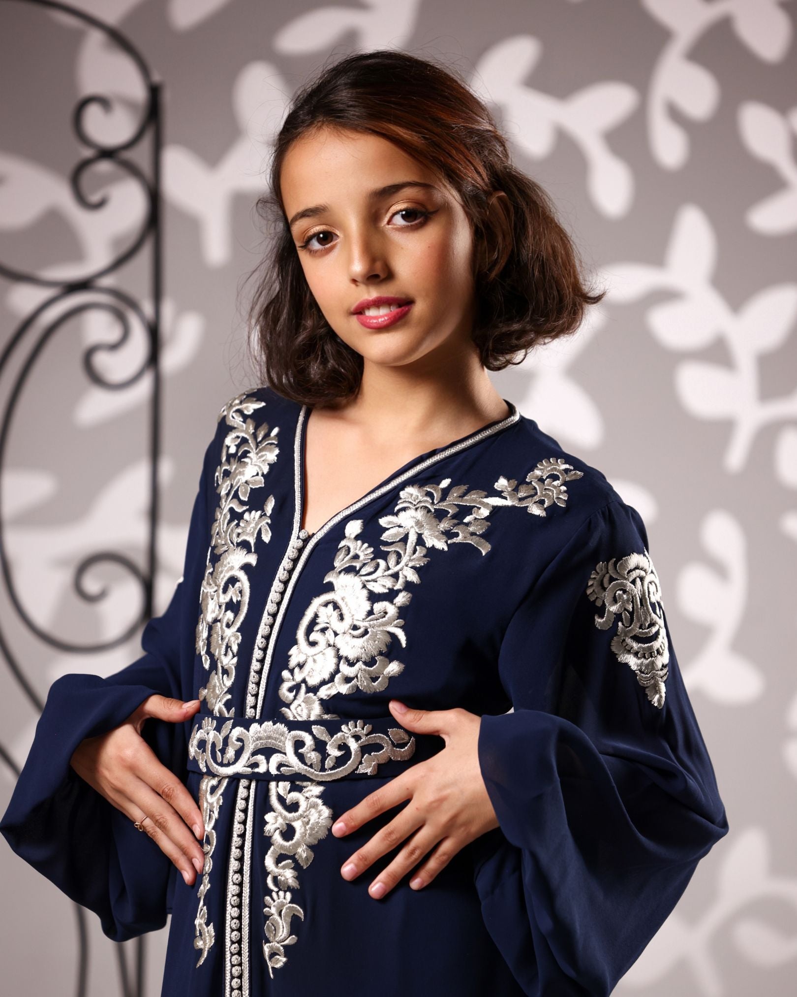 Inspiré de la douceur lunaire et du bleu nuit profond, ce caftan enfant reprend les codes élégants de la Maison dans une version poétique et raffinée.